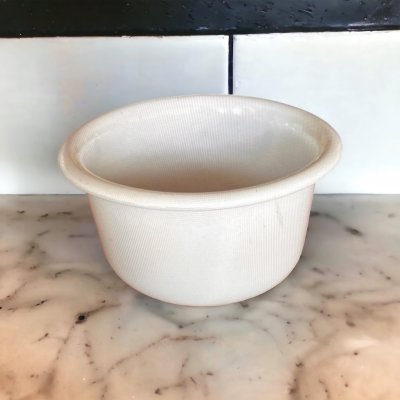 En skål i vitt stengods. Vissa skålar har sina infolappar kvar undertill, andra inte. Mycket fint skick!