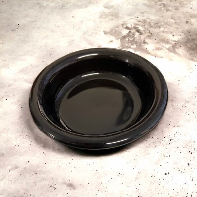 En svart djup tallrik. Detta är en äldre tallrik som saknar märkning undertill, den har en gång i tiden haft en pappersetikett. Fint skick!
