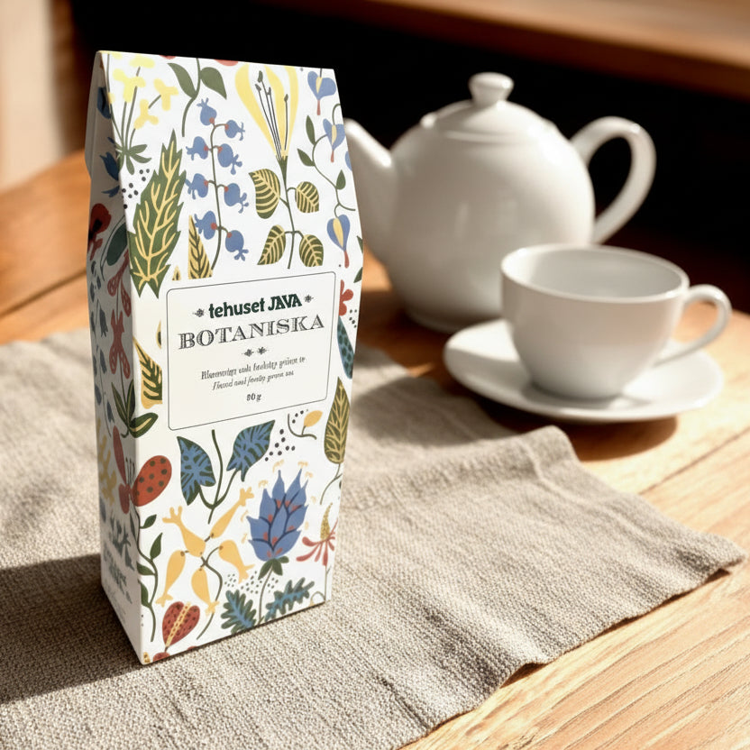 Ett gott grönt te i en snygg kartong. Teet är Tehuset Javas egen blandning och innehåller 80 gram grönt te med smak av frukt och blommor.