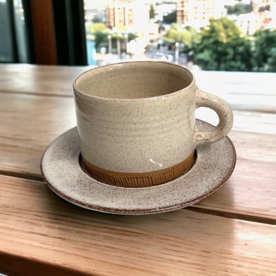 En vacker kopp med fat gjord i grov chamotte. Båda delarna signerade med spättan och SP-M. Färgen på koppens glasyr går åt det gulbeige hållet, medan fatet är mer gråvitt, absolut ingenting som stör! Koppen har en vackert dekorerad nederkant i det rå godset.
