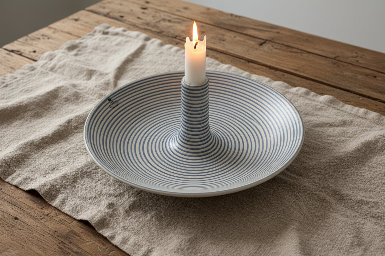 Elegant handdrejat ljusfat med handmålade linjer. Perfekt för att förgylla matbordet, myshörnan eller i fönsterkarmen. Anpassa dekorationen efter säsong, från nötter till godis till frukt eller stenar och snäckor.