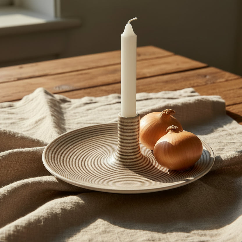 Elegant handdrejat ljusfat med handmålade linjer. Perfekt för att förgylla matbordet, myshörnan eller i fönsterkarmen. Anpassa dekorationen efter säsong, från nötter till godis till frukt eller stenar och snäckor.