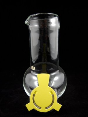 En ovanlig kanna av S P-M. Lock i limegrön metall. Fint skick, finns endast någon liten repa i glaset!