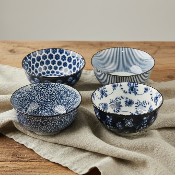 Stilrena och vackra skålar i fyra olika mönster i blått som ger en känsla av stil och harmoni. Passar lika bra i moderna hem som i lantlig inredning.