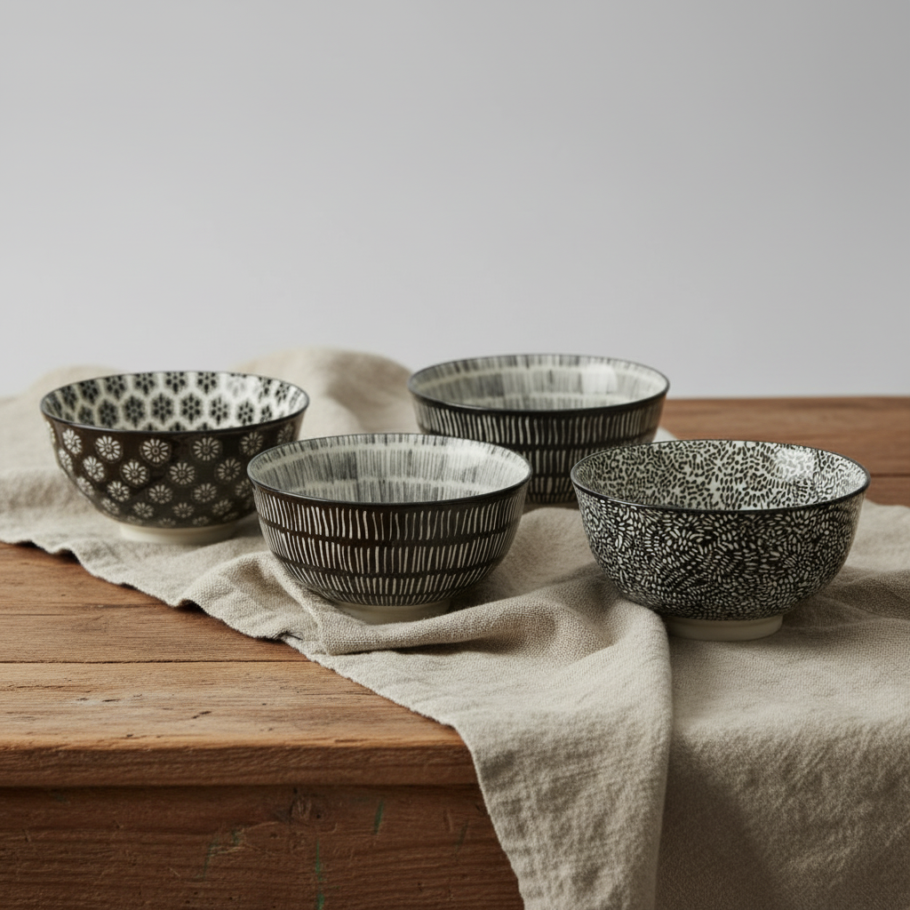 Stilrena och vackra skålar i fyra olika mönster i svart som ger en känsla av stil och harmoni. Passar lika bra i moderna hem som i lantlig inredning.