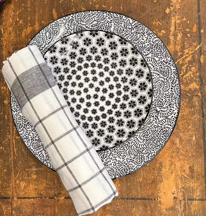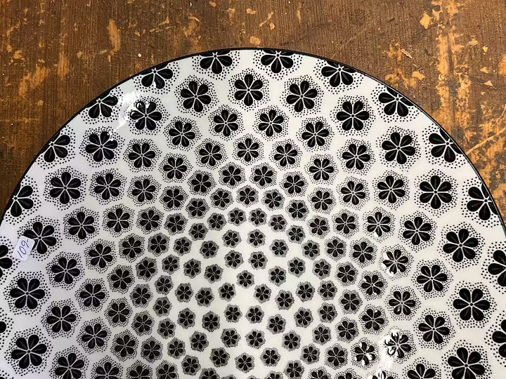 En stilren och vacker tallrik med tidlöst mönster med svart stiliserade blommor. Det eleganta motivet och den tunna svarta kanten ger en känsla av stil och harmoni.