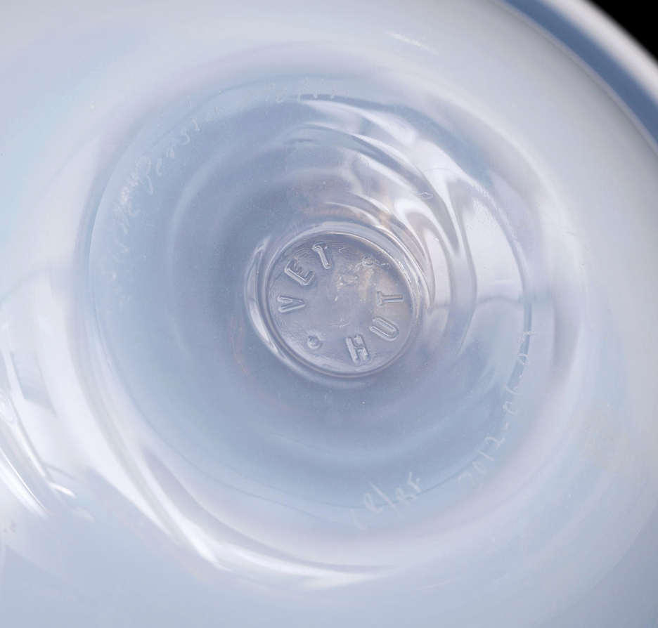 En stor och rejäl skål som är lika vacker med innehåll som utan! Skålen är formgiven av Signe Persson-Melin 2012 för Design House Stockholm på glasbruket "Vet Hut". Mycket vacker delvis opaliserat glas med överviktvikt kant. Alla vaser och skålar är namnsignerade ”Signe Persson-Melin” samt märkta med datum (januari till mars 2012). Nyskick!